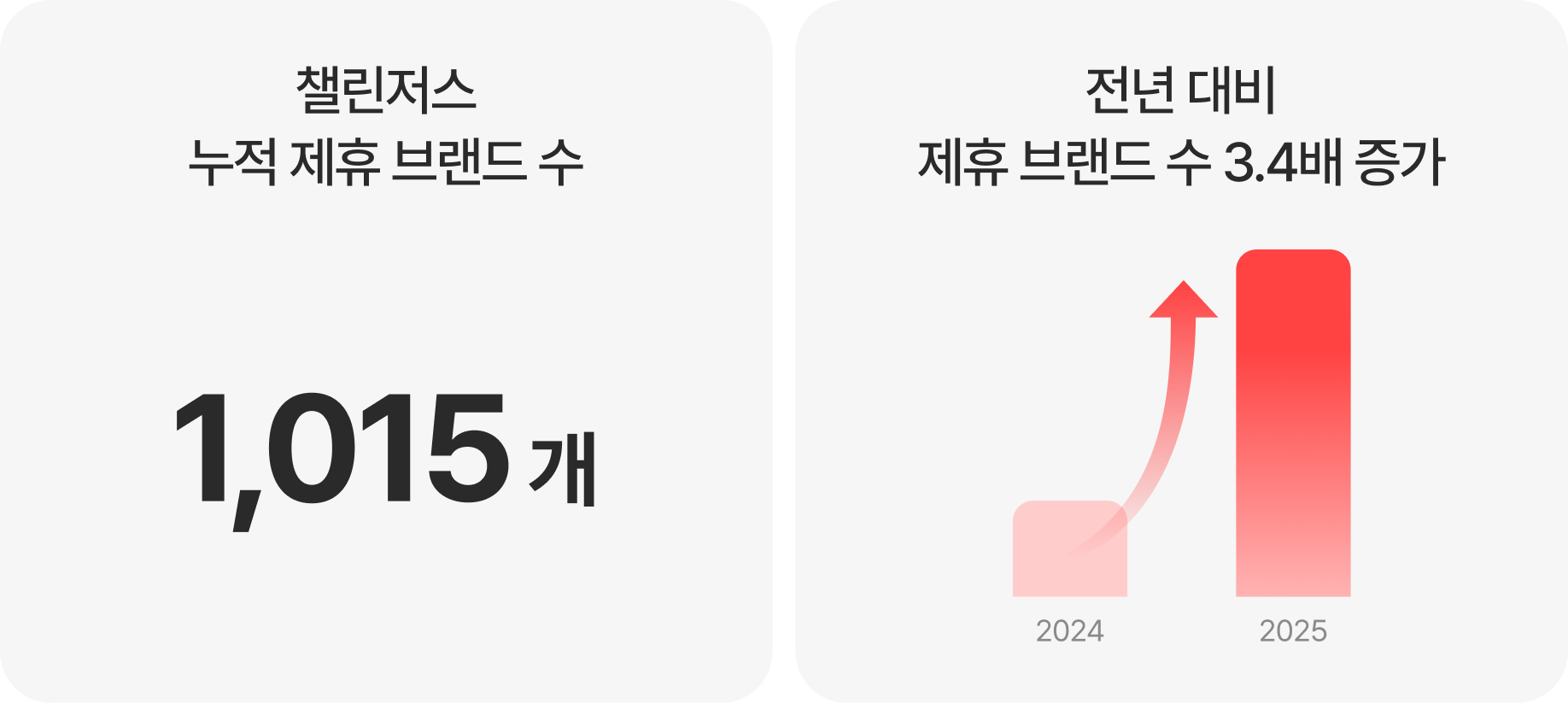 2025년 12월 기준, 챌린저스의 누적 제휴 브랜드 수는 총 1,015개로 전년 대비 3.4배 증가했습니다.