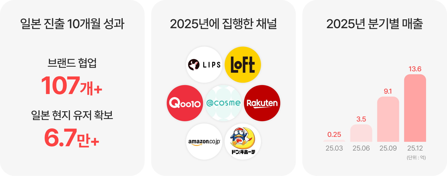 출시 이후 한 해 동안 일본 현지 유저 6.7만 명을 확보했고, 큐텐 재팬, 앳코스메, 아마존 재팬 등 총 107개 브랜드와 협업을 진행했습니다.