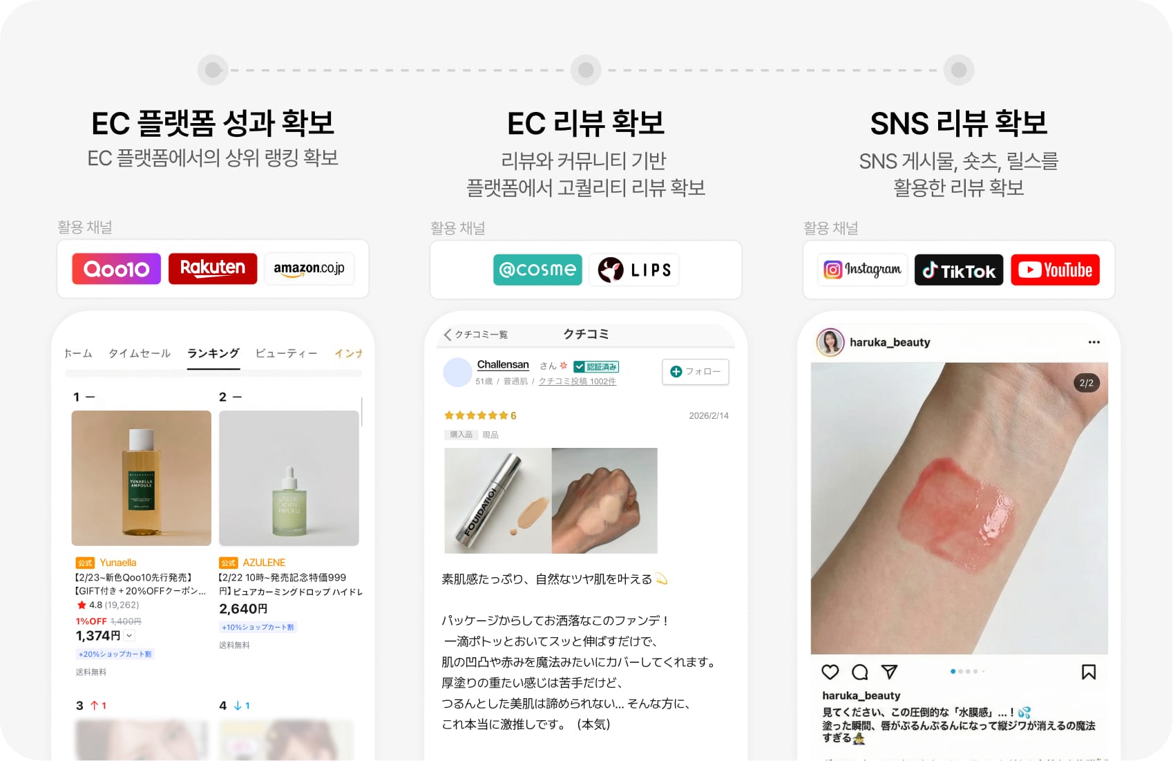 실제 소비자 행동도 “SNS/리뷰에서 발견 → EC에서 구매” 플로우가 강해졌고, K-뷰티는 이 경로에서 특히 경쟁력을 가지기 쉽습니다. 즉, 일본 전체에서 1등이 되는 것이 아니라, “온라인 + 특정 카테고리”에서 뾰족하게 포지셔닝하면 충분히 승산이 있습니다.