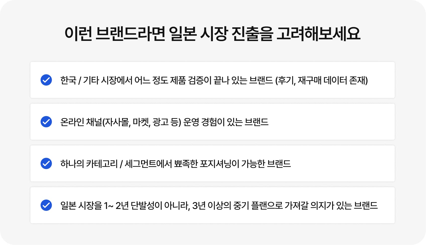 그렇다면 “지금” 일본 진출을 진지하게 고려해볼 만한 브랜드는 대략 이런 조건을 가진 곳입니다.