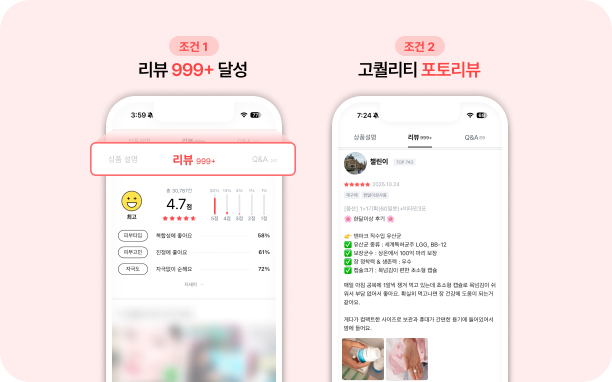 - 고퀄리티의 포토리뷰 : 제품에 대해 잘 설명할 수 있고, 소비자에게 공감을 줄 수 있는 고퀄리티 포토리뷰를 쌓아보세요.