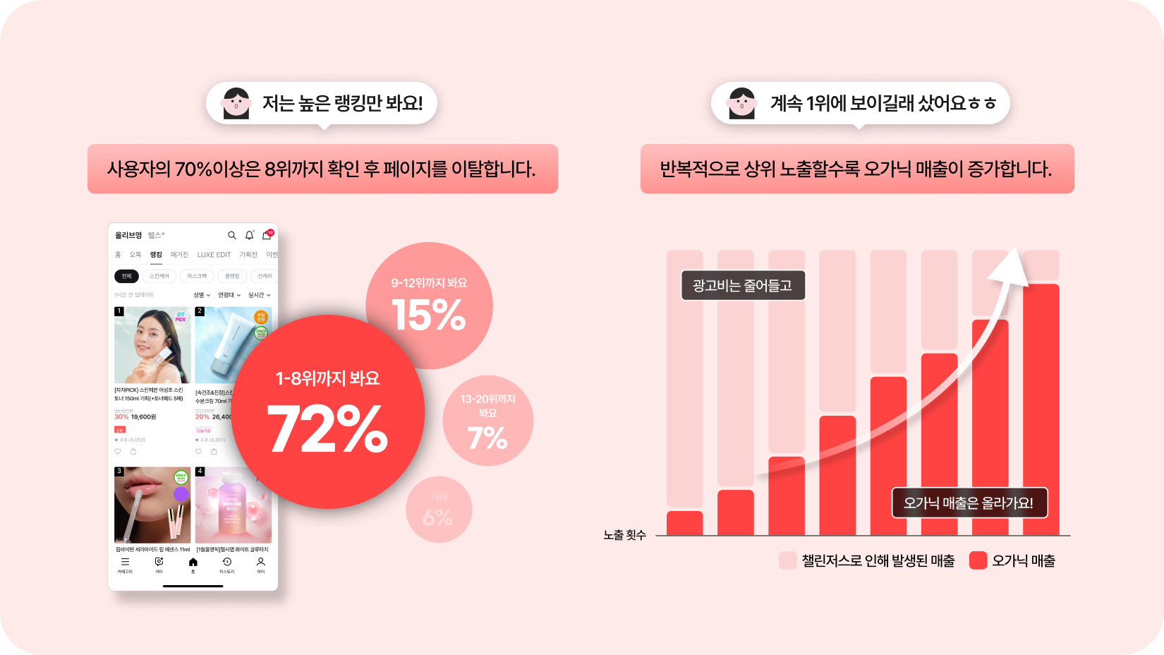 뷰티 플랫폼을 즐겨 찾는 2030 여성 소비자 설문조사 결과, 70% 이상은 랭킹 페이지의 TOP 8까지만 확인하고 이탈한다고 합니다. 그리고 소비자가 인지하는 TOP 8에 우리 제품이 반복 노출되었을 때, 관심 → 구매로 이어지는 비중은 훨씬 더 높았습니다. 실제로 챌린저스와 장기간 뷰티 커머스 마케팅을 함께해 온 브랜드들을 대상으로 인터뷰해보았을 때도, 20회 이상 상위 노출된 제품은 오가닉 매출 비율이 훨씬 높게 발생하였다고 해요!