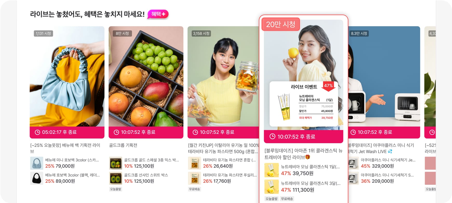 - 주부, 직장인 등 다양한 연령대가 몰리며, 특히 뷰티·스킨케어, 패션 소품, 건강식품, 주방용품, 생활가전 등 고관여 및 라이프스타일 관련 제품이 강세