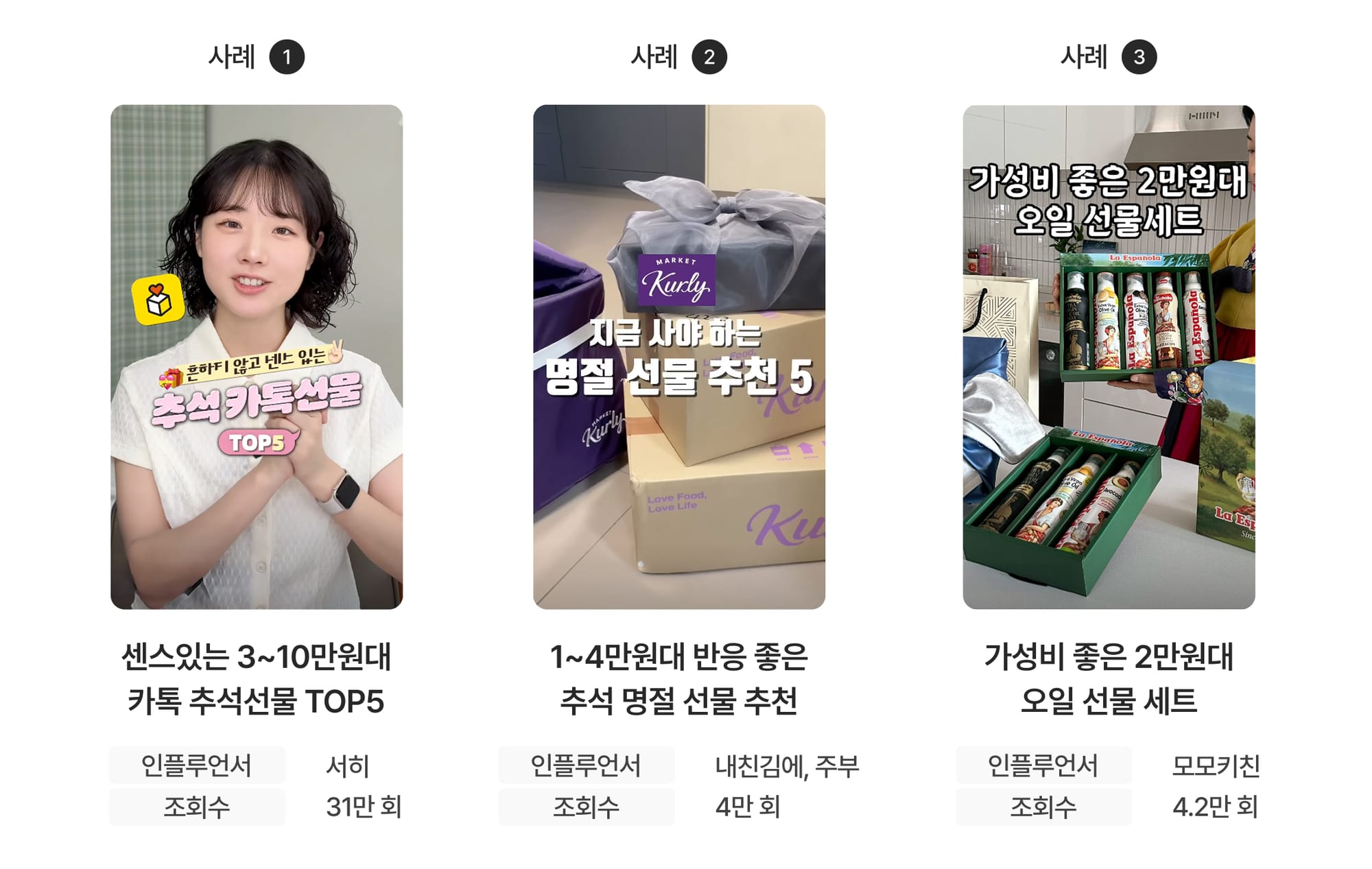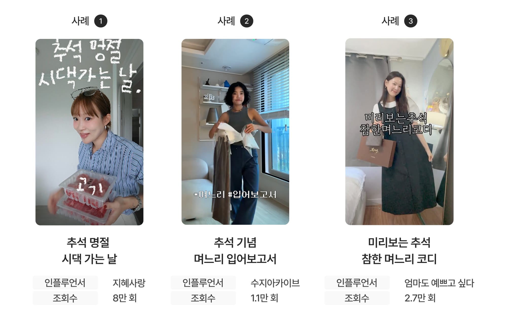 추석은 단순히 전통을 기리는 명절을 넘어, 브랜드에게는 연간 매출 목표 달성을 위한 중요한 전략적 시기인데요. 모두가 기쁨과 행복을 느끼는 추석 시기에는 진전성 있고 공감을 불러일으키는 인플루언서 콘텐츠가 큰 역할을 할 수 있습니다.