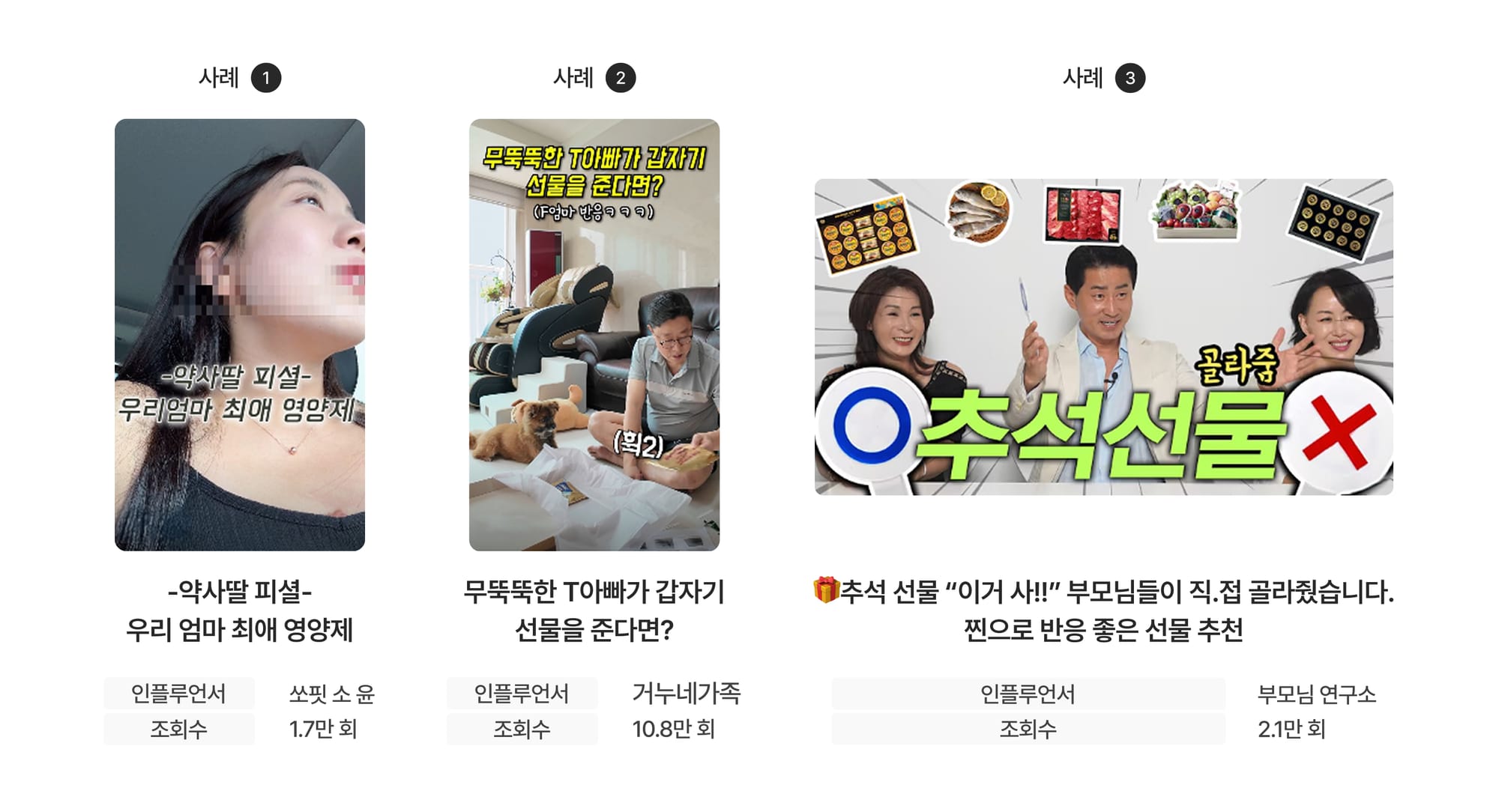 부모님 선물은 단순히 제품의 기능이 좋거나 콘텐츠 퀄리티가 높다고 해서 구매로 이어지기 어렵습니다. 오히려 다소 투박하더라도 부모님이 직접 제품에 만족하는 모습을 보여주면서 '효도'라는 정서적인 가치를 건드리는 콘텐츠가 효과적입니다. ‘인플루언서의 부모님이 직접 등장하는 브이로그’나, ‘부모님이 직접 고른 선물들을 보여주는 영상’은 구매를 유도하기 좋은 콘텐츠입니다. 아래 세 가지의 사례를 소개해드립니다.