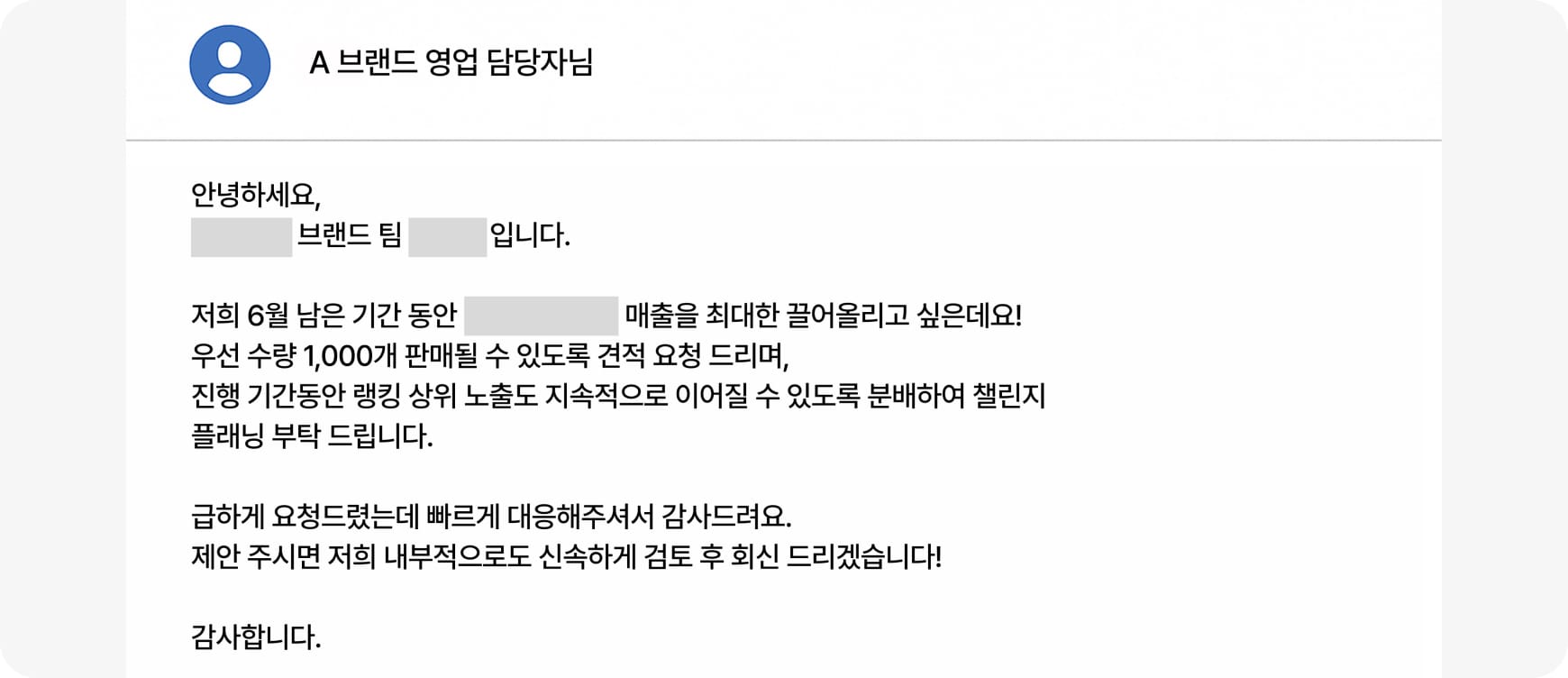 색조로 유명한 A 브랜드는 6월 마지막 주를 앞두고 특정 제품의 매출 목표를 급하게 채워야 했는데요, 챌린저스에서 3일간 1,000건의 구매 캠페인을 진행하여 단기간에 목표 매출을 달성할 수 있었어요!