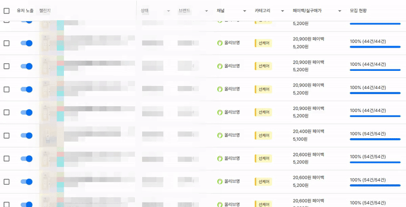 선크림이 대표 상품인 C 브랜드는 부족한 국내 매출을 올리기 위해 챌린저스에서 한 제품으로 4개월간 꾸준히 캠페인을 진행했어요! 커머스 채널에서 반복적인 제품 노출로 확실한 인지도를 확보하게 되어, 최근에는 신제품으로 캠페인을 함께 하고 있어요.🙂