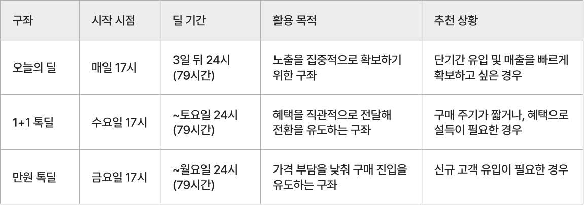 👉 오늘의 딜은 트래픽이 집중되는 노출 중심 구좌로, 상품의 가격·구성 경쟁력이 중요한 구조입니다.