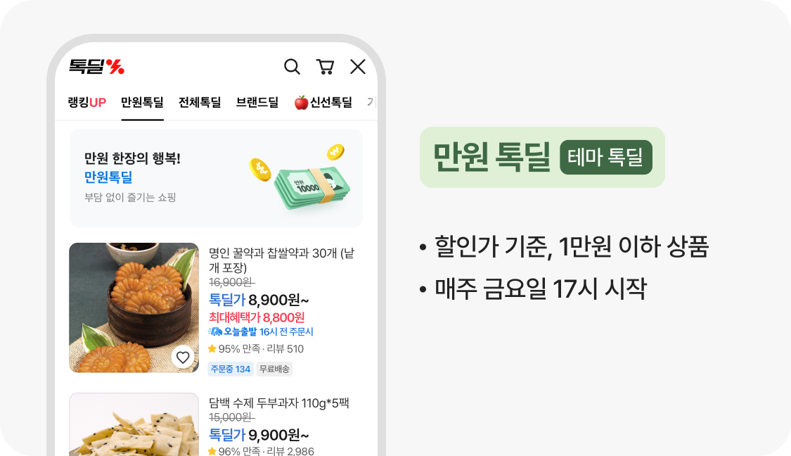 👉 만원 딜은 가격 기준을 통해 구매 부담을 낮추는 구조로, 신규 고객 유입에 적합한 구좌입니다.