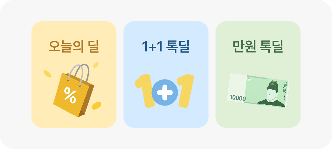 대표적으로는 오늘의 딜, 1+1 톡딜, 만원 톡딜과 같은 구좌가 있으며, 각 딜은 노출 방식과 혜택 구조가 다르게 설계되어 있습니다.
