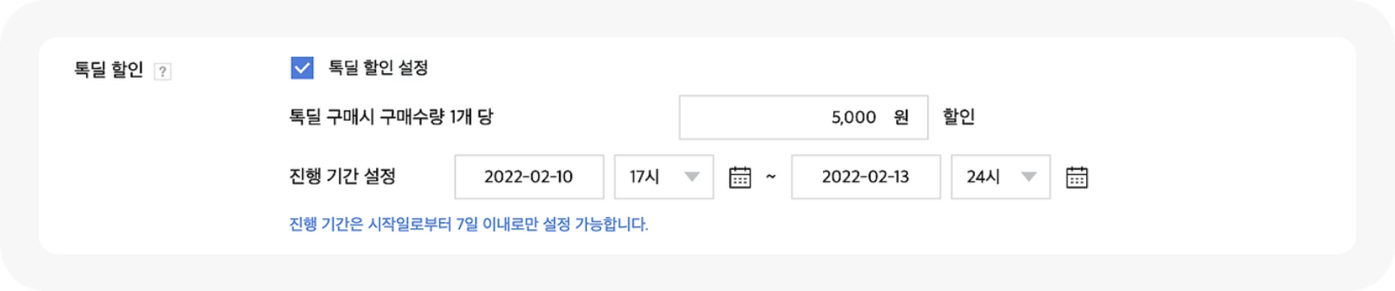 여기서 중요한 점은, 반드시 ‘톡딜 할인’ 영역에서 설정해야 한다는 것입니다.