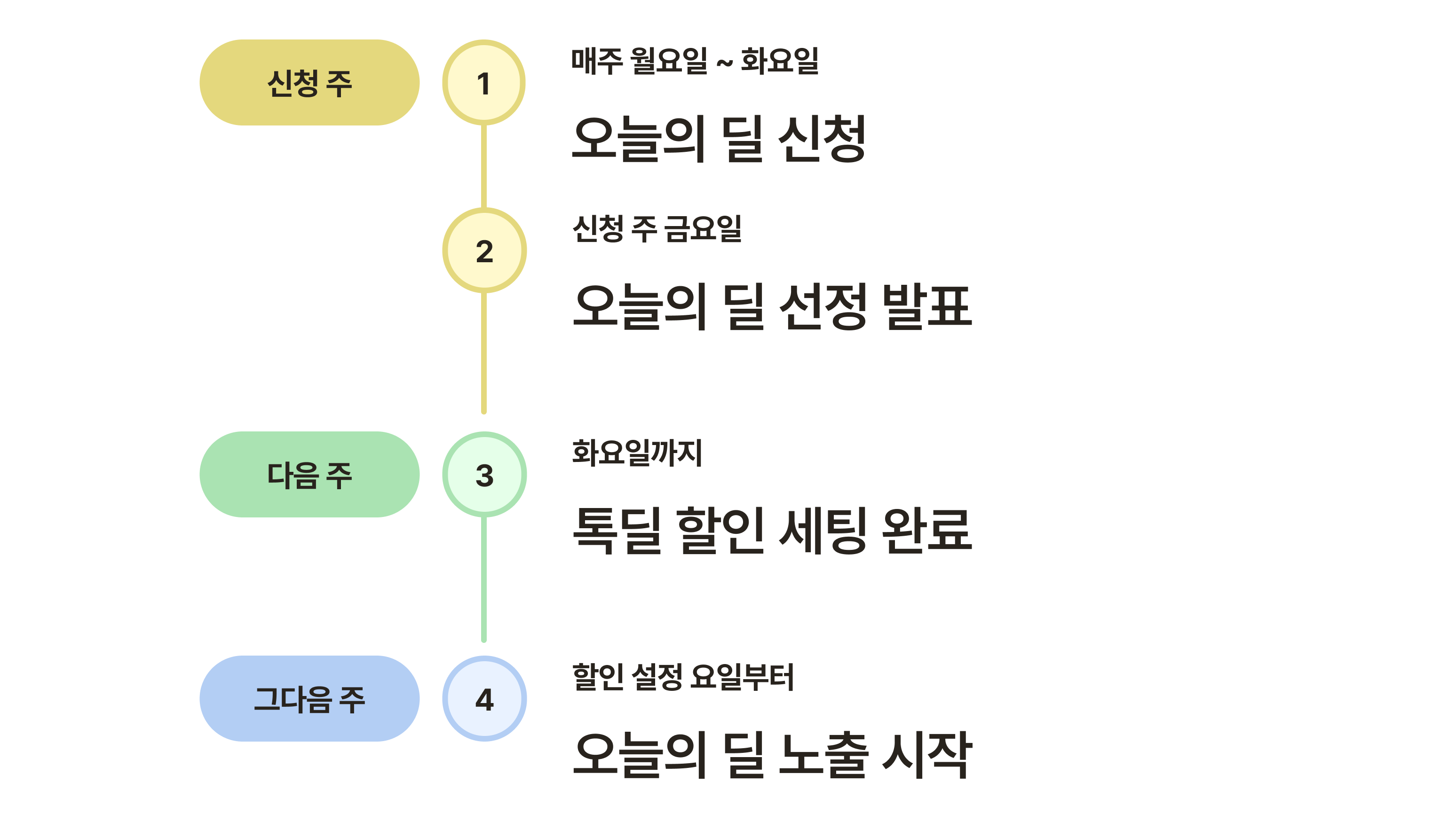 오늘의 딜은 매주 신청 가능하며, 신청한 주를 기준으로 약 3주 흐름으로 보면 이해하기 쉽습니다.