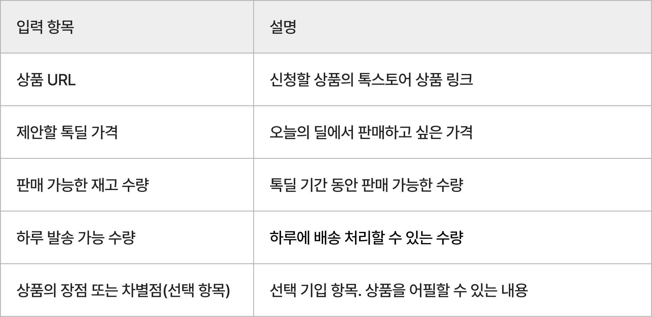 이 중에서도 톡딜 가격, 재고 수량, 하루 발송 가능 수량은 특히 중요합니다.