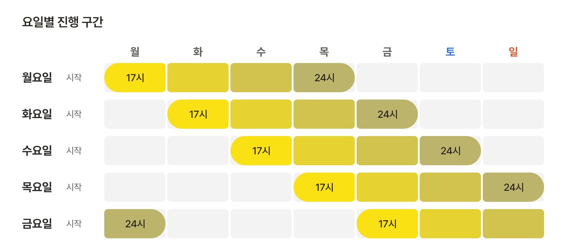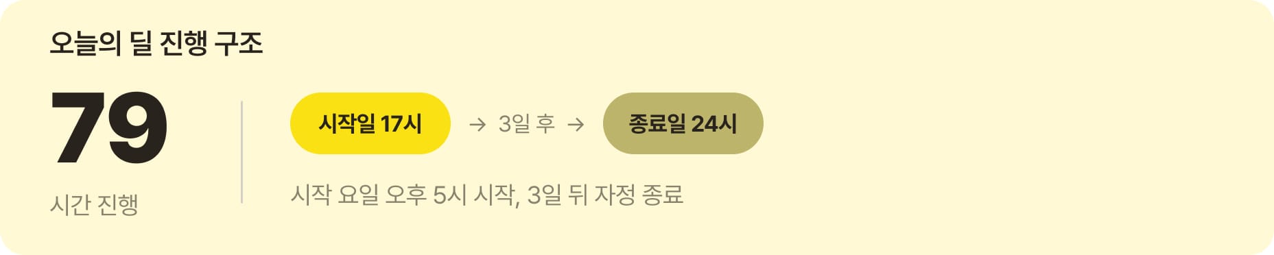 오늘의 딜은 보통 시작일 17시부터 3일 뒤 24시까지, 총 79시간 진행됩니다. 예를 들어 수요일 17시에 시작하면 토요일 24시에 종료되는 구조입니다.