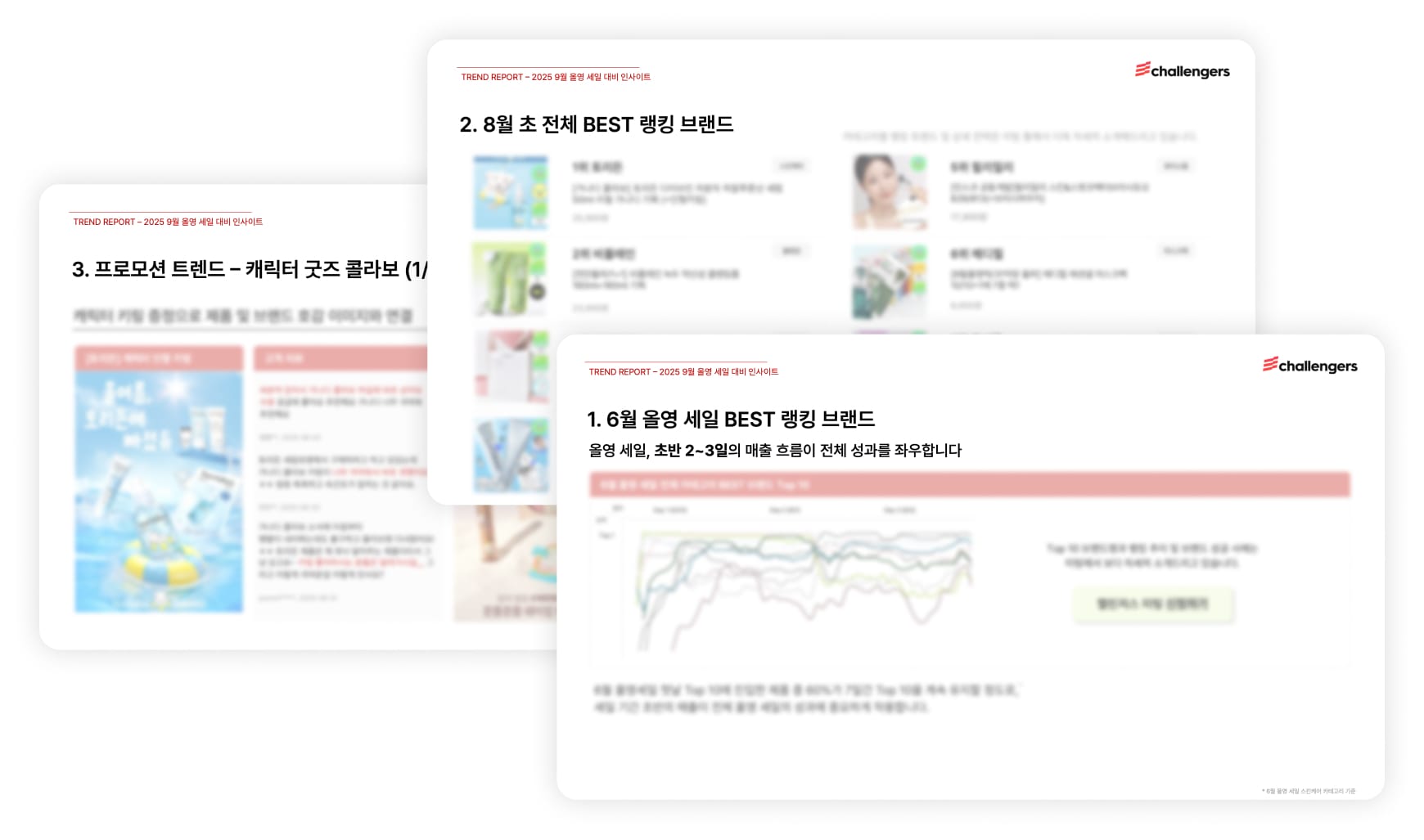챌린저스는 6월 세일 기간 동안 수십 개 브랜드와 함께 카테고리 최상위 노출 및 매출 성과를 만들어냈습니다. 9월 세일을 앞둔 지금, 브랜드가 소비자의 마지막 선택 순간에 선택받기 위한 전략을 확인해 보세요.