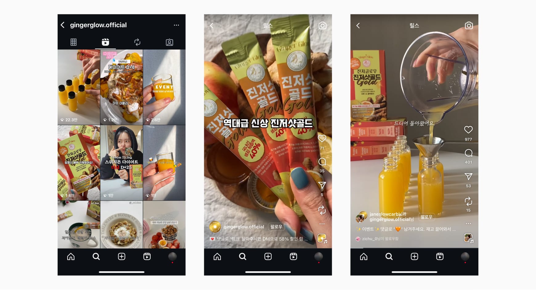 처음엔 외국 릴스랑 유튜브를 통해 ‘진저샷’이라는 시장을 알게 되었어요. 당시엔 국내에 없던 개념이었지만, 2년쯤 지나 국내에 진입하자마자 공동구매로 빠르게 고객 반응을 확인해봤어요. 생각보다 반응이 좋아서 “아, 젊은 사람들도 생강을 좋아하는구나” 싶었고요. 그때부터 본격적으로 브랜드에 들어갔고, 그렇게 진저글로우가 시작됐죠.
