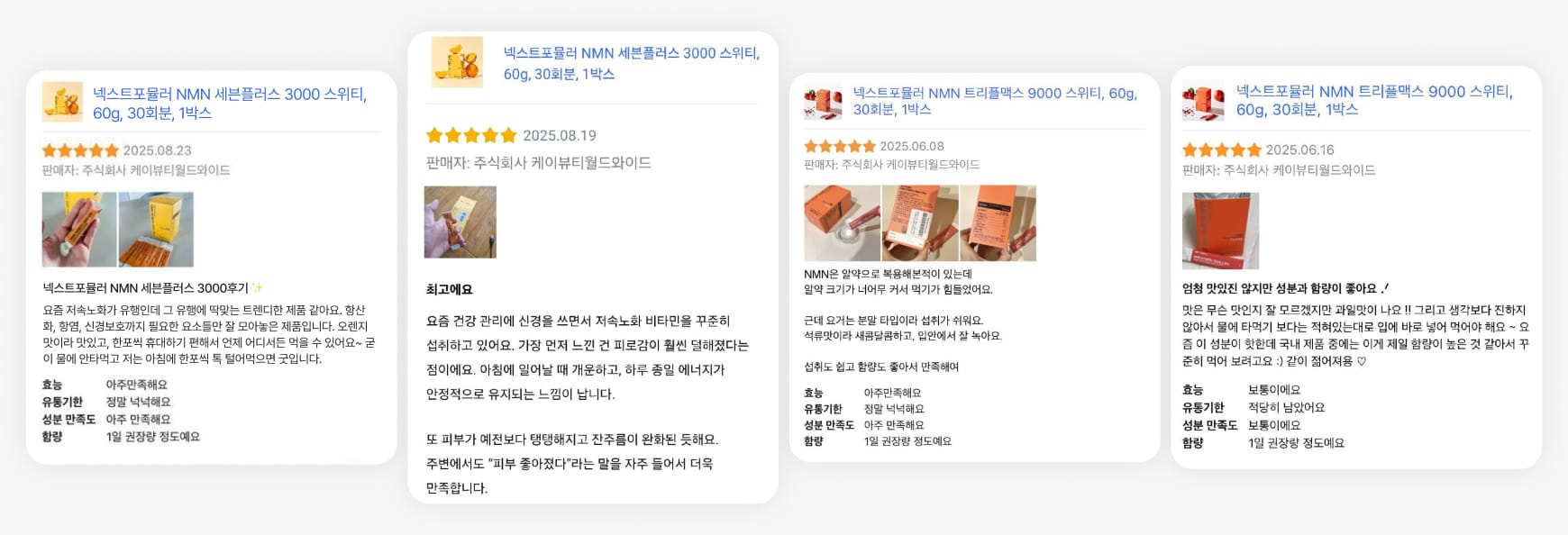 NMN은 국내에서 생소한 원료라, 무엇보다 실제 구매자 리뷰가 중요했습니다. 작은 금액이라도 직접 결제하고 사용한 경험이 있는 고퀄리티 리뷰를 통해 제품에 대한 신뢰도가 빠르게 쌓일 수 있었던 것 같아요.