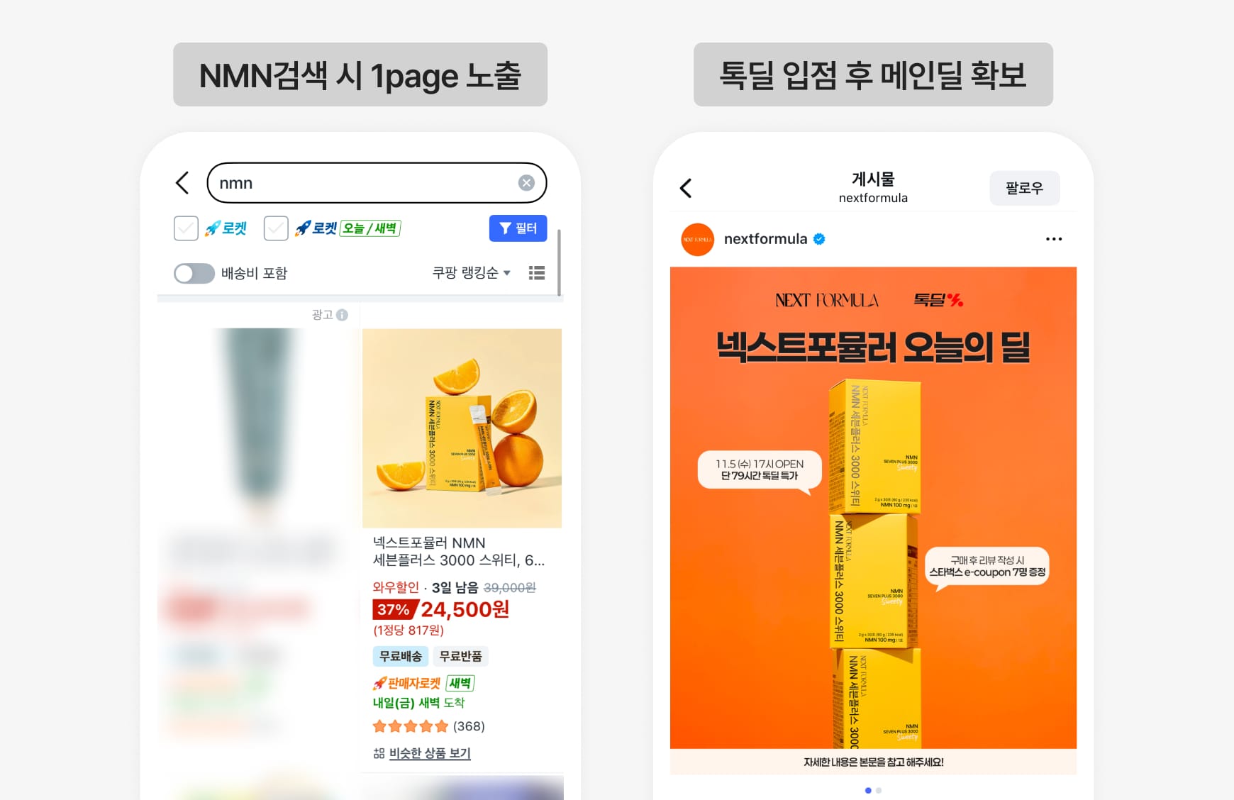 덕분에 지금은 쿠팡에서 NMN 검색만 해도 안정적으로 1page 상단에 노출되고 있고, 그에 따라 매출도 폭발적으로 성장했어요. 지금은 전체 브랜드 매출의 90%가 쿠팡에서 발생하고 있고, 쿠팡에서 발생한 매출 성장 추이 레퍼런스 덕분에 톡딜 입점 후 메인 딜 확보에도 크게 기여하였습니다.