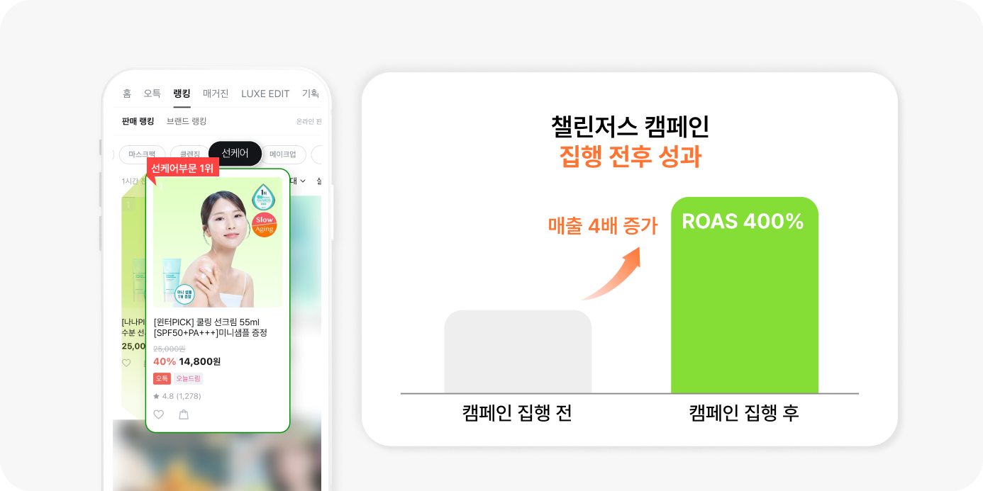 짧은 기간의 집중적인 반복 집행이, 프로모션 초반의 주목도를 높이고 이후 매출 성장의 흐름까지 이어졌어요.